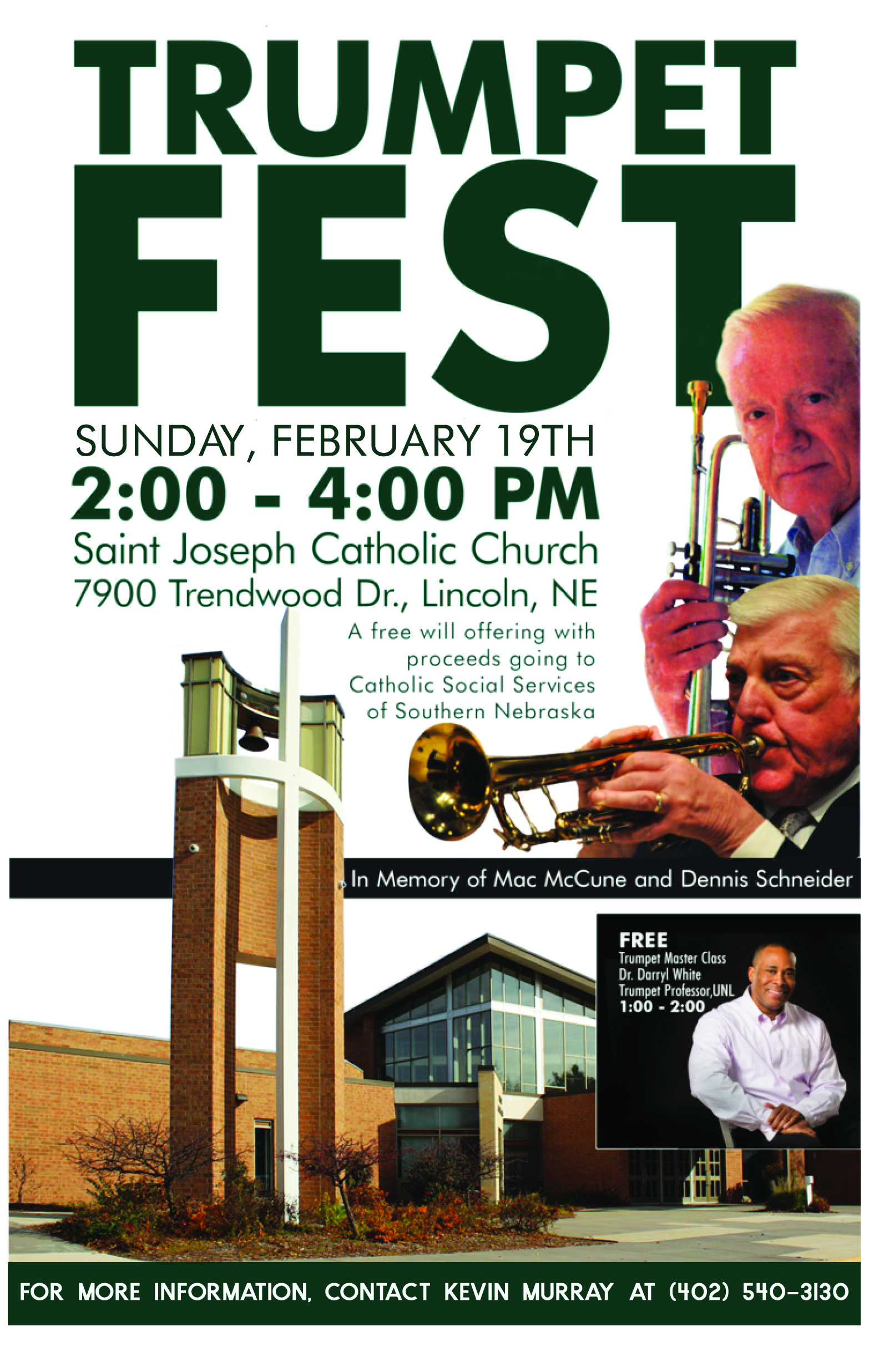 Enjoy an afternoon of wonderful music and bring "Hope in the Good Life" to those helped by Catholic Social Services of Southern Nebraska! This fun event will kick off with a FREE Trumpet Master Class with Dr. Darryl White, UNL from 1-2 pm. Our concert begins at 2 pm and features many outstanding trumpet players! The proceeds from our free-will offering will go to support the many services provided by CSS throughout southern Nebraska.